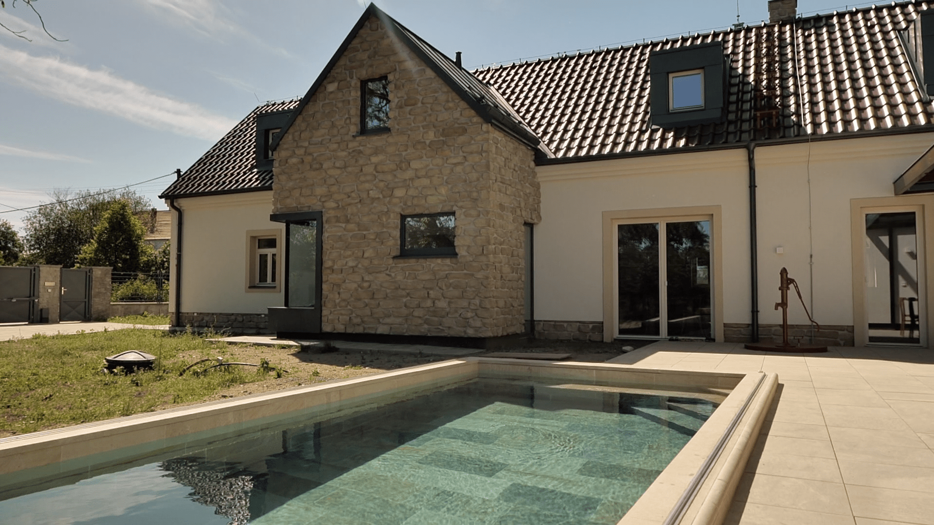 Dále k domu přibyla garáž, malé wellness, venkovní, zapuštěný, monolitický bazén a mnoho venkovních úprav.